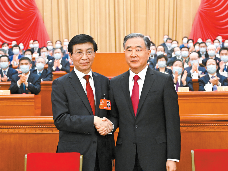 سايلام نەتىجىسى ئوقۇپ ئۆتۈلۈشتىن ئىلگىرى، 13 - نۆۋەتلىك مەملىكەتلىك سىياسىي كېڭەشنىڭ رەئىسى ۋاڭ ياڭ يىغىن مەيدانىغا كېلىپ، بارلىققا كېلىش ئالدىدا تۇرغان يېڭى بىر نۆۋەتلىك سىياسىي كېڭەش مەملىكەتلىك كومىتېتى دائىمىي كومىتېتىنى تەبرىكلىدى. يىغىن رىياسەتچىسى ۋاڭ خۇنىڭنىڭ سىياسىي كېڭەش مەملىكەتلىك 14 - نۆۋەتلىك كومىتېتىنىڭ رەئىسلىكىگە سايلانغانلىقىنى جاكارلىغاندىن كېيىن، ۋاڭ ياڭ ئورنىدىن تۇرۇپ تەبرىكلەپ، ۋاڭ خۇنىڭ بىلەن قىزغىن قول ئېلىشىپ كۆرۈشتى، پۈتۈن مەيداندا ئۇزاققىچە ئالقىش ساداسى ياڭرىدى.