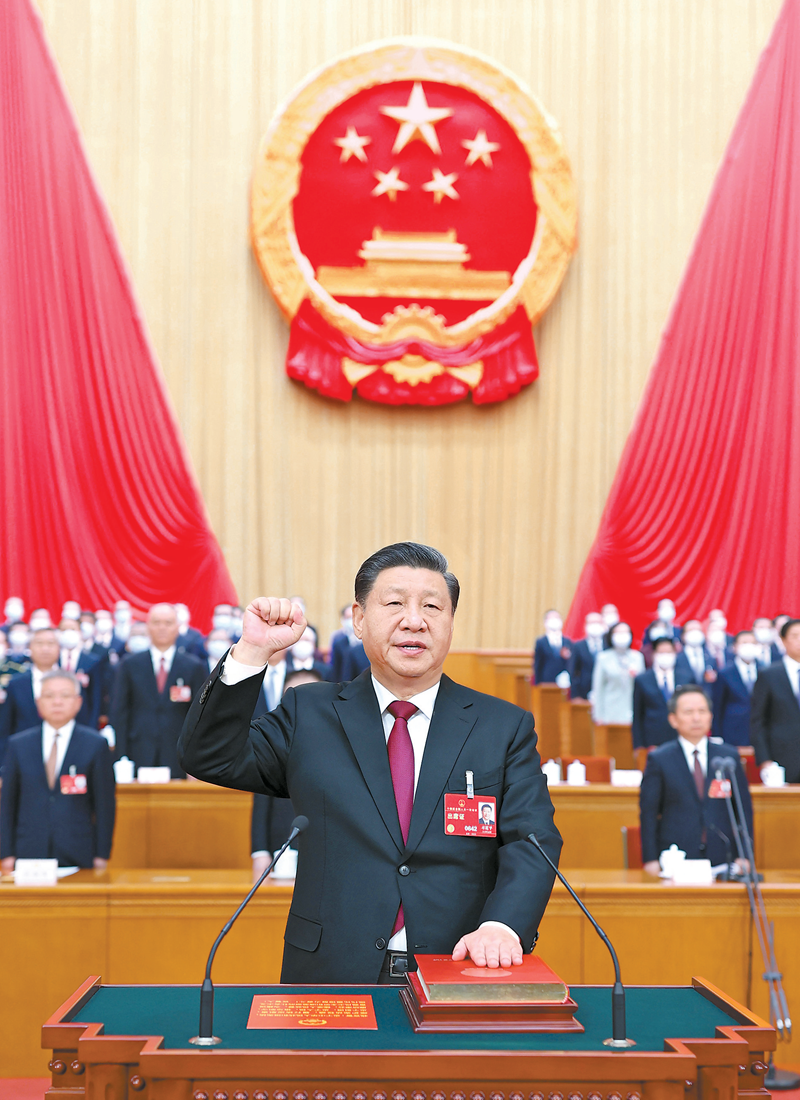 3 - ئاينىڭ 10 - كۈنى، 14 - نۆۋەتلىك مەملىكەتلىك خەلق قۇرۇلتىيى 1 - يىغىنى بېيجىڭ خەلق سارىيىدا 3 - ئومۇمىي يىغىن ئۆتكۈزدى. شى جىنپىڭ تولۇق ئاۋاز بىلەن جۇڭخۇا خەلق جۇمھۇرىيىتىنىڭ رەئىسلىكىگە، جۇڭخۇا خەلق جۇمھۇرىيىتى مەركىزىي ھەربىي كومىتېتنىڭ رەئىسلىكىگە سايلاندى. سۈرەتتە: شى جىنپىڭ ئاساسىي قانۇن قەسىمى بەرمەكتە. □شىنخۇا ئاگېنتلىقى مۇخبىرى جۈ پېڭ فوتوسى