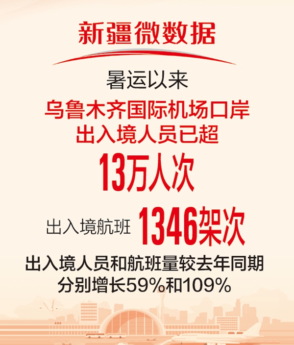 شىنجاڭ چېگرادىن كىرىش - چىقىش چېگرا مۇداپىئە تەكشۈرۈش باش پونكىتى ئۈرۈمچى چېگرادىن كىرىش - چىقىش چېگرا مۇداپىئە تەكشۈرۈش پونكىتىنىڭ ئىستاتىستىكىسىغا ئاساسلانغاندا، چېگرادىن كىرىش - چىقىشقا قولايلىق بىر قاتار سىياسەتلەرنىڭ يولغا قويۇلۇشىغا ئەگىشىپ، 7 - ئايدا يازلىق تەتىللىك توشۇش باشلانغاندىن بۇيان، ئۈرۈمچى خەلقئارا ئايروپورتى ئارقىلىق چېگرادىن كىرگەن - چىققان كىشىلەر ئېقىمى ئىزچىل يۇقىرى پەللە ھالىتىدە تۇرغان، بۇنىڭ ئىچىدە بىر كۈندە ئەڭ يۇقىرى پەللە 8 - ئاينىڭ 21 - كۈنى كۆرۈلۈپ، 2865 كىشىگە يەتكەن.